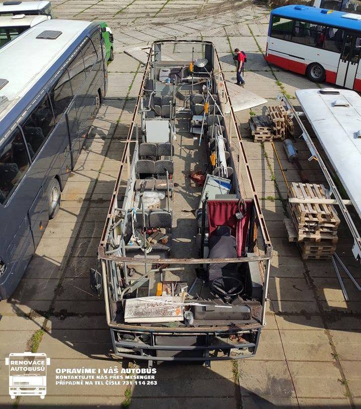 Vpravo již čeká na instalaci zánovní střecha, která byla získána z jiného autobusu.
