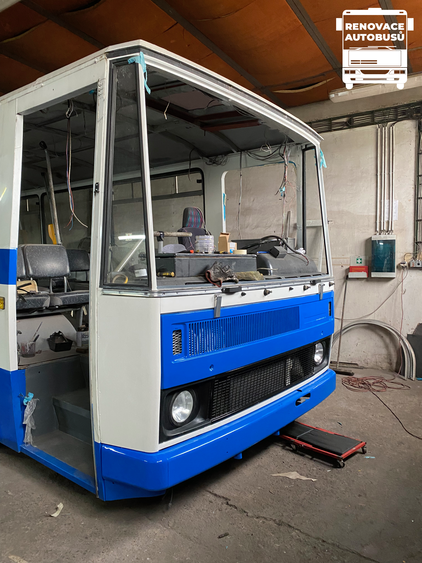 Po menší odmlce jsme opět zpět s renovací tohoto vozu, pomalu se nám rýsují tvary. Zpět se skládá s opatrností interiér do původního stavu, který bylo nutno pro výměnu střechy sundat, k tomu patří i nová elektroinstalce vozu.